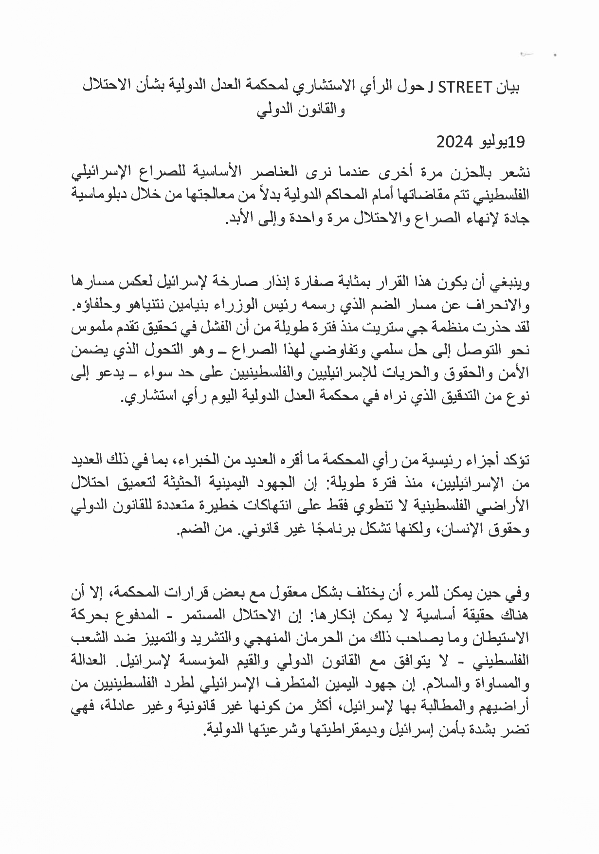 بيان J STREET حول الرأي الاستشاري لمحكمة العدل الدولية بشأن الاحتلال والقانون الدولي