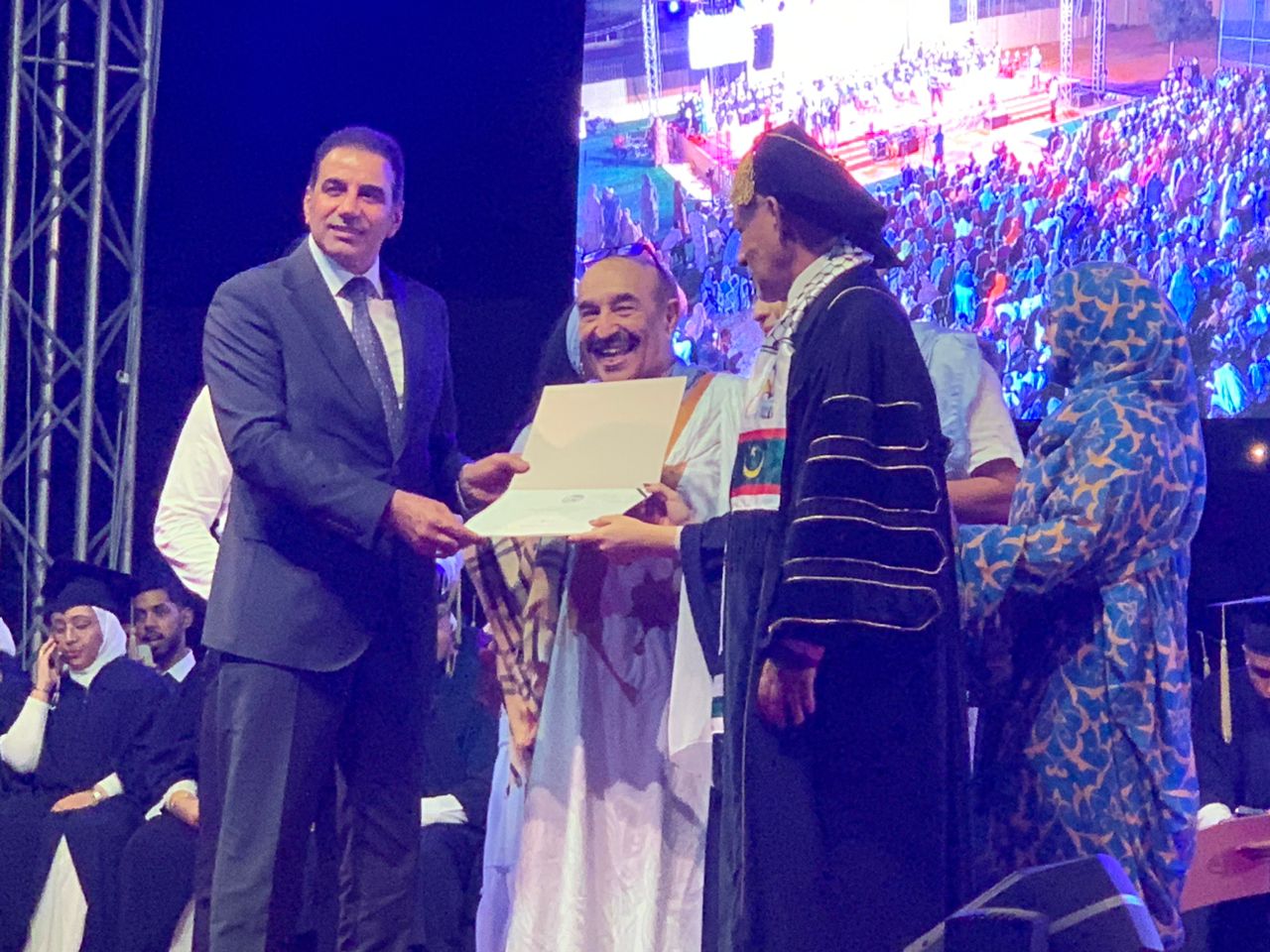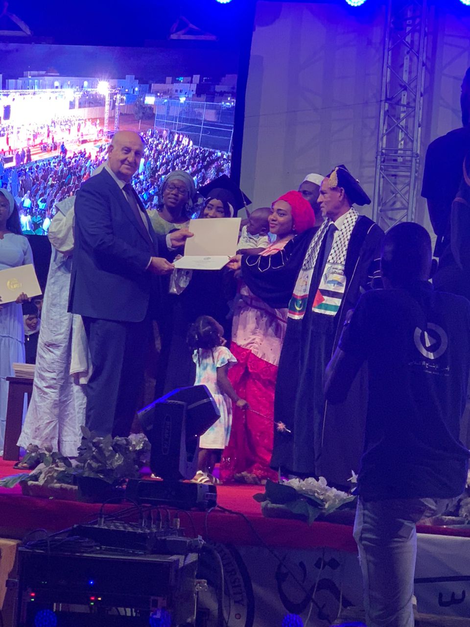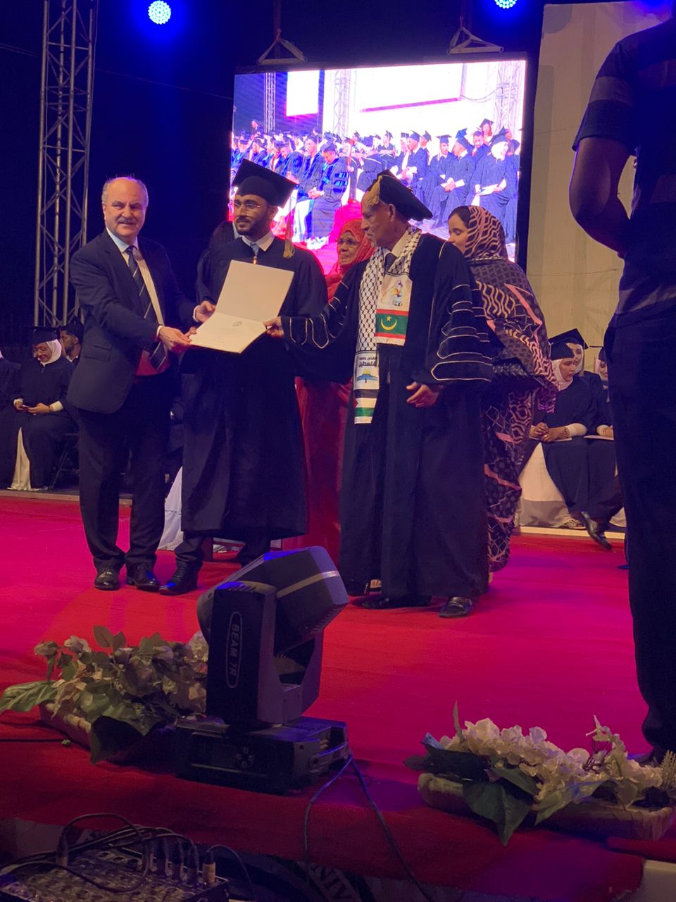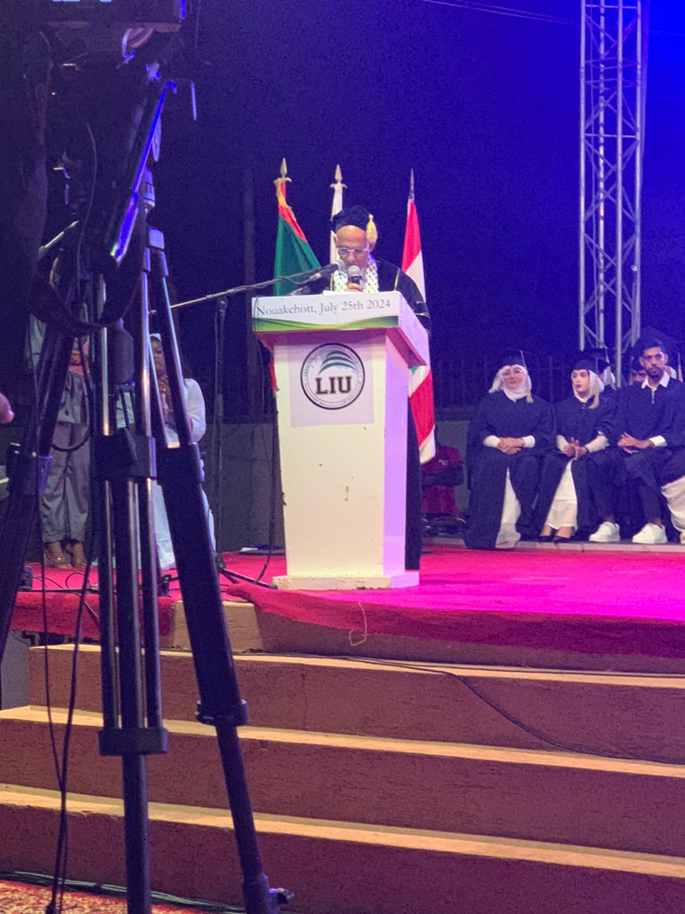 26/07/20214 - نواكشوط - تحت رعاية معالي وزير التعليم العالي والبحث العلمي الموريتاني السيد أنيانغ مامدوا و بدعوة كريمة من رئيس الجامعة اللبنانية الدولية معالي الوزير عبد الرحيم مراد شارك سفير دولة فلسطين لدى موريتانيا الدكتور محمد الاسعد بتسليم الشهادات الجامعية في حفل تخرج الطلبة للعام الدراسي 2023-2024 و بحضور رسمي و شعبي و في كلمة لعميد الجامعة معالي الوزير الأسبق محمد ولد فال اكد على دعم بلاده و تضامنه الشخصي و الشعبي مع الشعب الفلسطيني و متمنيا ان ينتهي هذا الظلم بدولة فلسطينية مستقلة عاصمتها القدس الشريف