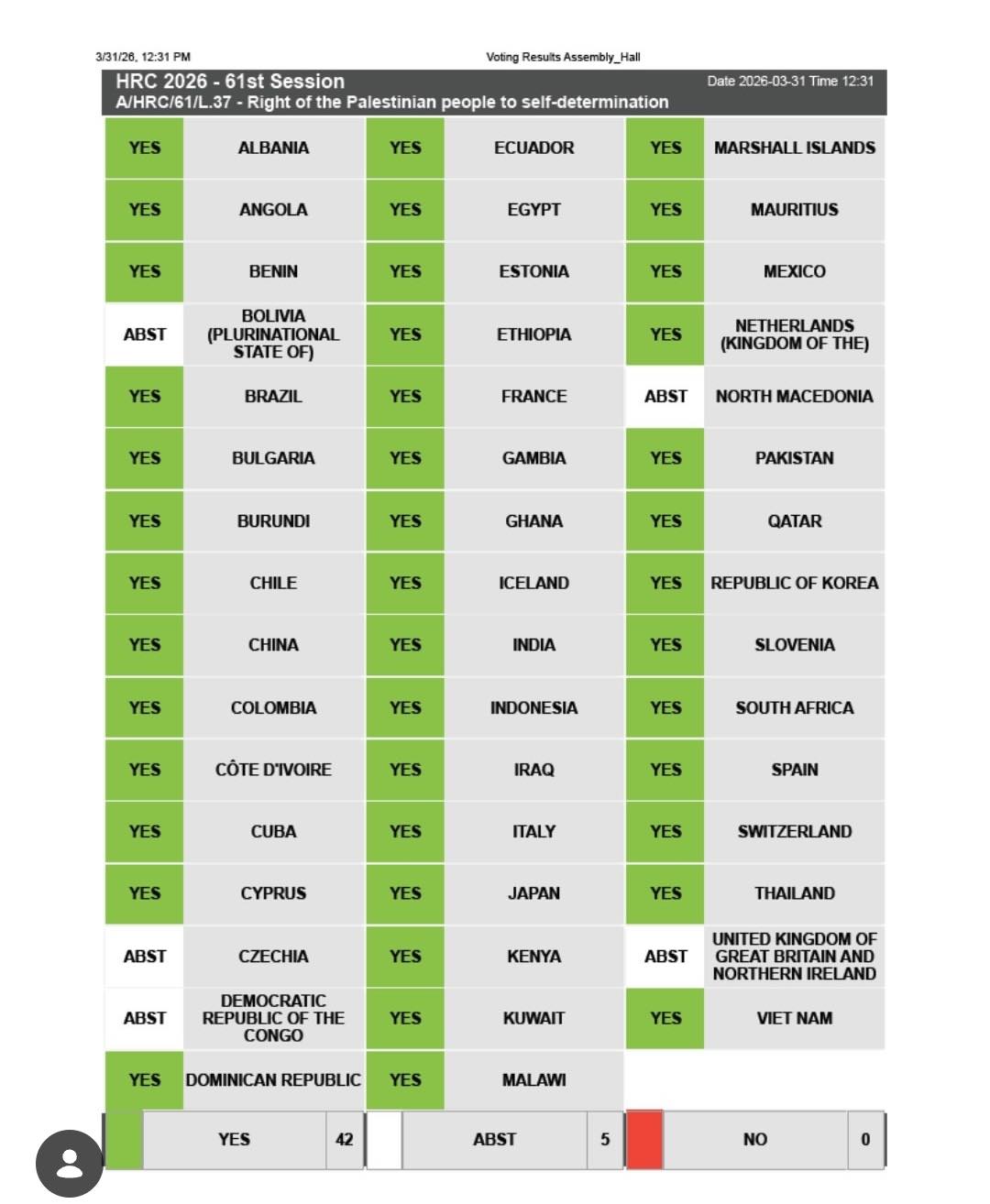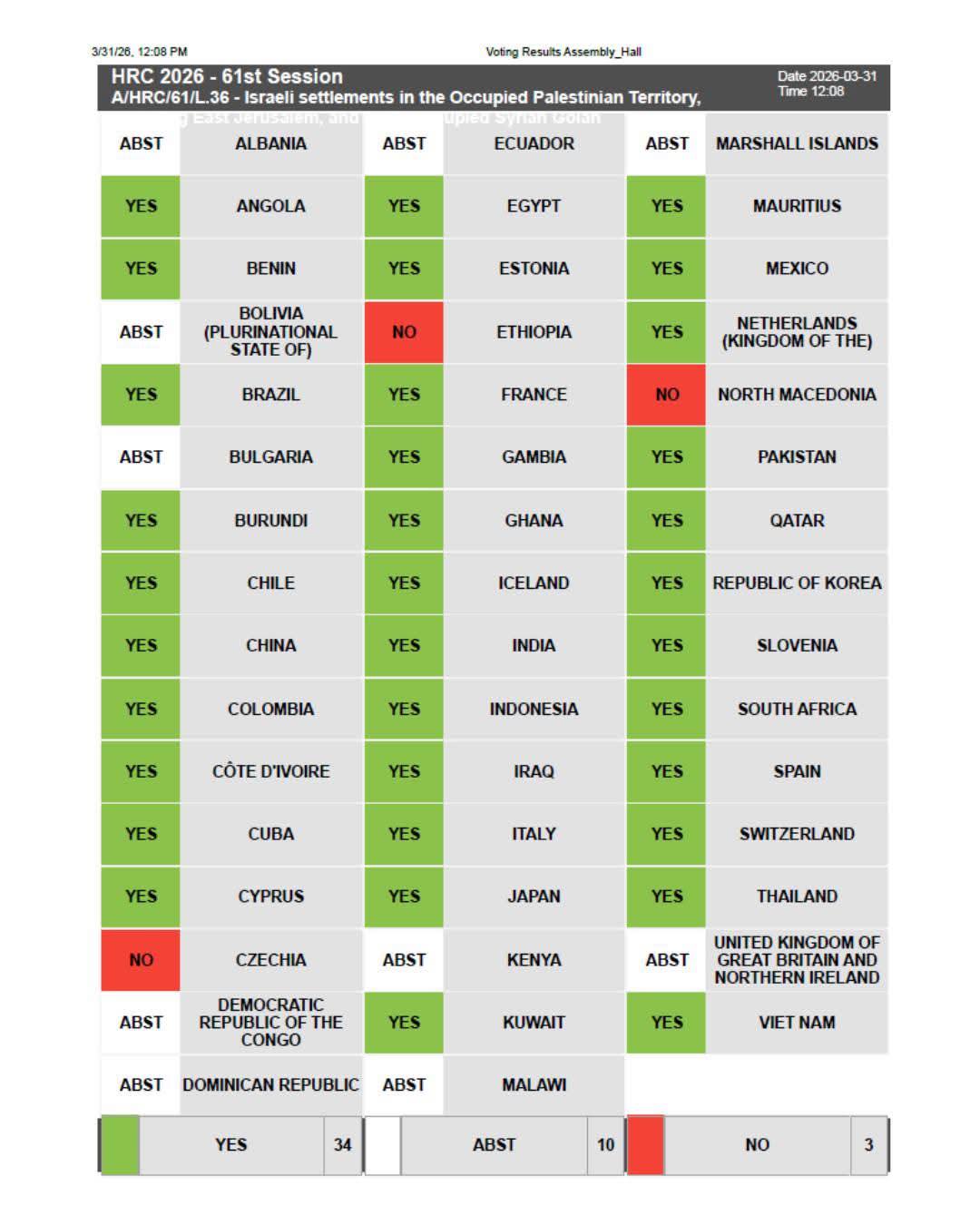 حيث صوتت (34) دولة لصالح قرار "المستوطنات الإسرائيلية في الأرض الفلسطينية المحتلة، بما فيها القدس الشرقية والجولان السوري المحتل" في حين صوتت (3) دول ضد القرار وامتنعت عن التصويت (10) دول. اما القرار " حق الشعب الفلسطيني في تقرير المصير"، فقد صوتت لصالحه (42) دولة في حين امتنعت (5) دول عن التصويت.