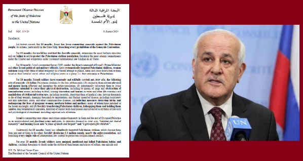 جنيف 15-10-2024 - بعث المندوب الدائم لدولة فلسطين لدى الأمم المتحدة، الوزير رياض منصور، بثلاث رسائل متطابقة إلى كل من: الأمين العام للأمم المتحدة، ورئيس مجلس الأمن لهذا الشهر (سويسرا)، ورئيس الجمعية العامة للأمم المتحدة، محذراً من استمرار إسرائيل، القوة القائمة بالاحتلال، في ارتكاب جرائم الإبادة الجماعية وجرائم الحرب والجرائم ضد الإنسانية في قطاع غزة بشكل علني.