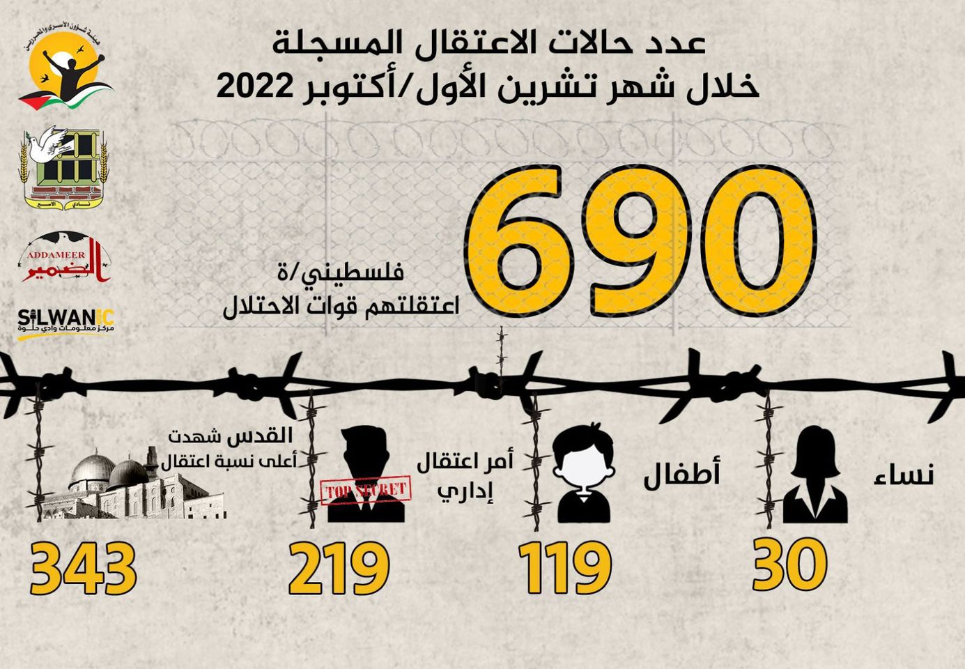 رام الله 9-11-2022 - نقلاً عن وكالة وفا- اعتقلت قوات الاحتلال الإسرائيلي، 690 مواطنا ومواطنة، بينهم (119) طفلا، و(30) سيدة،خلال شهر تشرين الأول/ أكتوبر الماضي.
