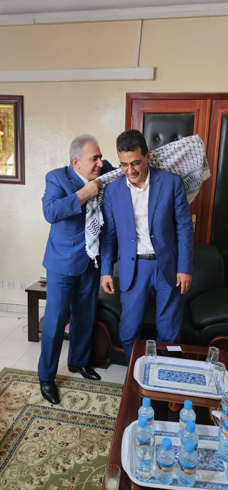 في الاول من اغسطس استقبل والي نواكشوط الغربية (محافظ) السيد عين ولد عابدين سفير دولة فلسطين لدى موريتانيا و الوفد المرافق كل من المستشار الاول د قصي الماضي و المستشار زكي قديح و الاخ جمال الصباح في مكتبه و بحضور مديرة مكتبه و تناول الطرفان العلاقات الثانية بين البلدين الشقيقين و القضايا ذات الاهتمام المشترك و وضع سفير فلسطين الوالي لما يتعرضه الشعب الفلسطيني من اعتقالات و انتهاكات يومية من قبل المحتل و خاصة مدينة القدس العاصمة الابدية لدولة فلسطين و بدوره حيا الوالي صمود الشعب الفلسطيني و تضامنه الكامل مع نضاله العادل للوصول الى دولة مستقلة و عاصمتها القدس و ابدى استعداده لتقديم المساعدات لسفارة دولة فلسطين و في نهاية اللقاء قدم سفير فلسطين هدية للوالي مجسم للقدس و كوفية فلسطينية