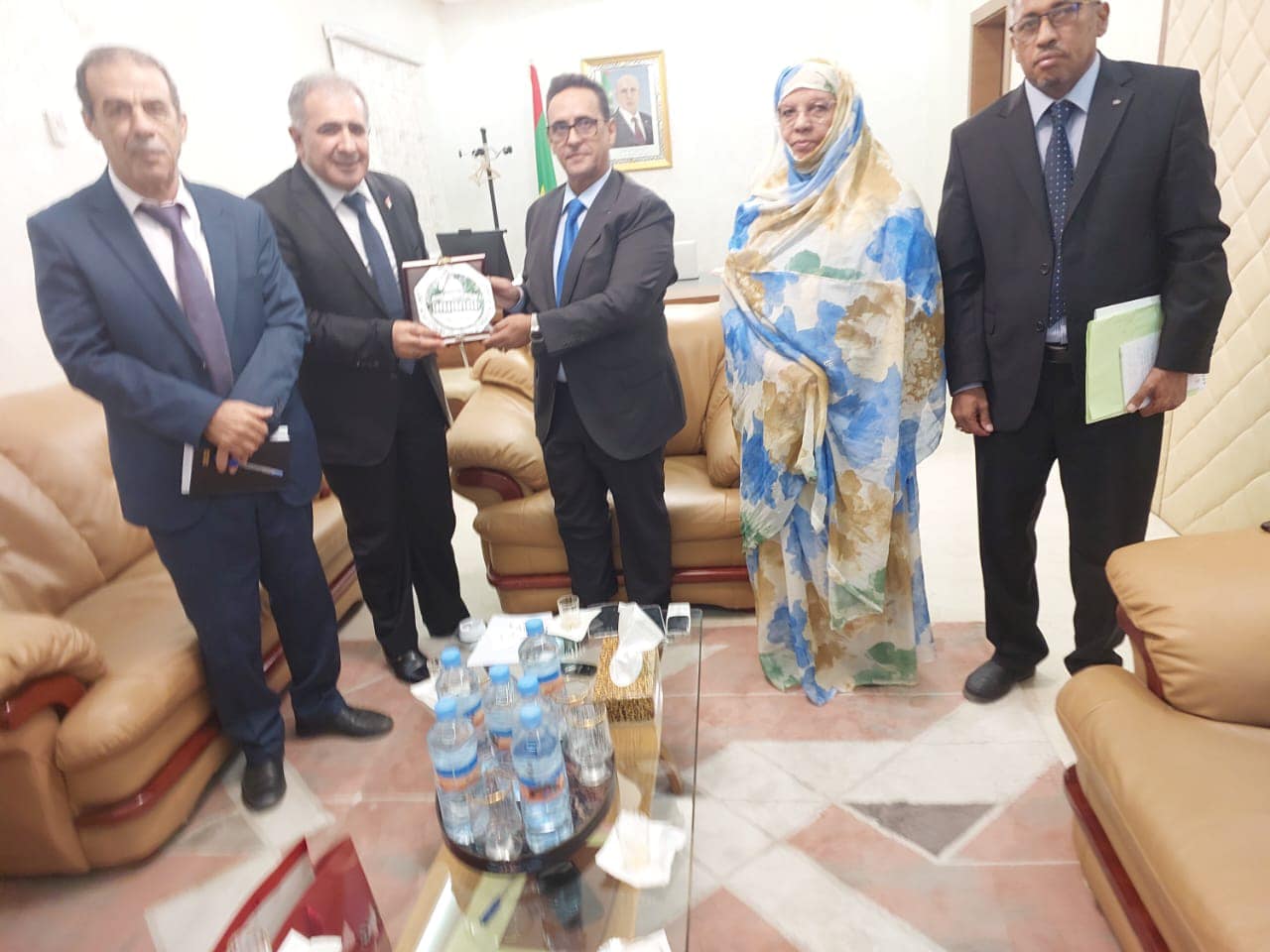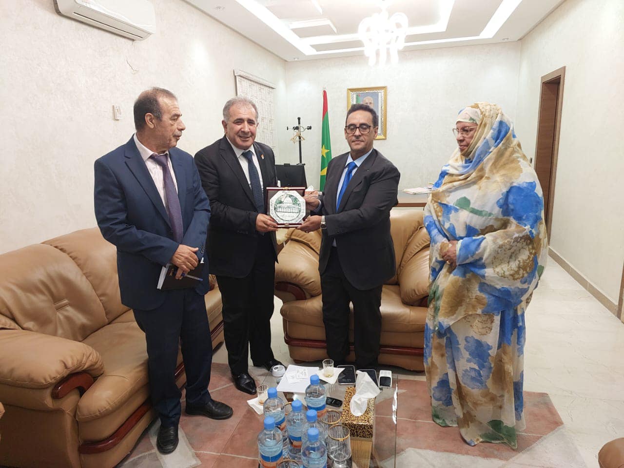 التقى سفير دولة فلسطين لدى موريتانيا بوزير الثقافة و الشباب و الرياضة و العلاقات مع البرلمان السيد احمد سيد احمد أج في مقر الوزارة و بحضور الامينة العامة للوزارة و مسؤول العلاقات الدولية لدى الوزارة اليوم الثلاثاء بتاريخ 8 اغسطس 2023 و تناول الطرفان العلاقات الثنائية و القضايا ذات الاهتمام المشترك ووضع السفير معالي الوزير بمعاناة الشعب الفلسطيني لما يتعرض له من قبل الاحتلال و الجهود الدبلوماسية لاستصدار فتوى من قبل محكمة العدل الدولية و في نهاية اللقاء قدم السفير والوفد المرافق كل من المستشار الاول الدكتور قصي الماضي و الاخ جمال الصباح درع القدس و الكوفية الفلسطينية