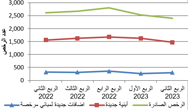 بلغ عدد رخص الأبنـية الصادرة للمباني السكنيـة وغير السكنيـة 2,395 رخصة خلال الربع الثاني من العام 2023، منها 1,467 رخصة أبنية جديدة.