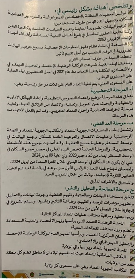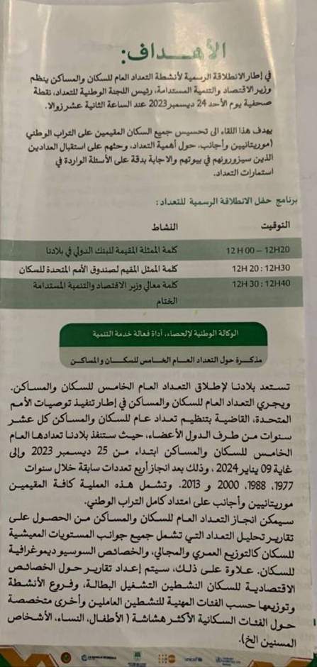 إلى كافة ابناء الجالية الفلسطينية المتواجدين على التراب الموريتاني و في أطار الانطلاقة الرسمية لانشطة التعداد العام للسكان و المساكن ينظم وزير الاقتصاد و التنمية المستدامة ، رئيس اللجنة الوطنية للتعداد نقطة صحفية يهدف هذا اللقاء إلى اشعار جميع السكان المقيمين على التراب الموريتاني (موريتانيين ، اجانب) حول أهمية التعداد و حثهم على استقبال العدادين الذي سيزرونهم في بيوتهم و الإجابة بدقة على الاسئلة الواردة في استمارة التعداد التي ستكون بحوزة العدادين ، حيث أنه ستنفذ تعدادها العام الخامس للسكان و المساكن ابتداءاً من 25/12/2023 إلى غابة 09/01/2024 ، و ذلك بعد انجاز اربعة تعدادات سكانية سابقة خلال سنوات 1977 ، 1988 ، 2000 ، 2013.