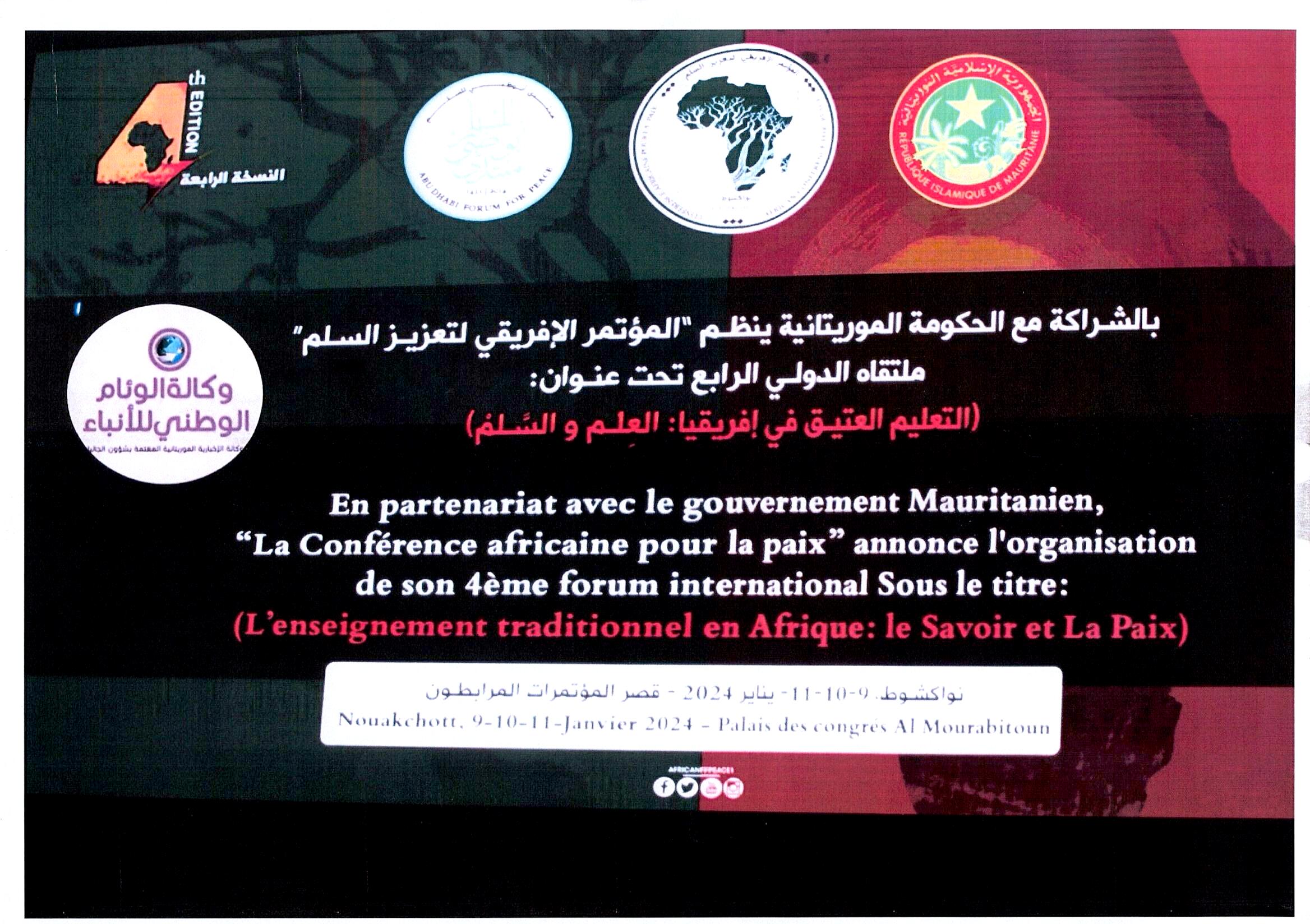 شارك سفير دولة فلسطين في المؤتمر الافريقي لتعزيز السلم للنسخة الخامسة حيث استمر اعمال المؤتمر ثلاثة ايام ، ووصف الشيخ عبد الله بن بيه الحرب الاسرائيلية في غزة بأنها حرب بربرية همجية ، وطالب الشيخ بن بيه في كلمته لدى افتتاح مؤتمر التعليم العتيق في افريقيا بوقف الحرب الوحشية الهمجية التي تشن على اخواننا في غزة.