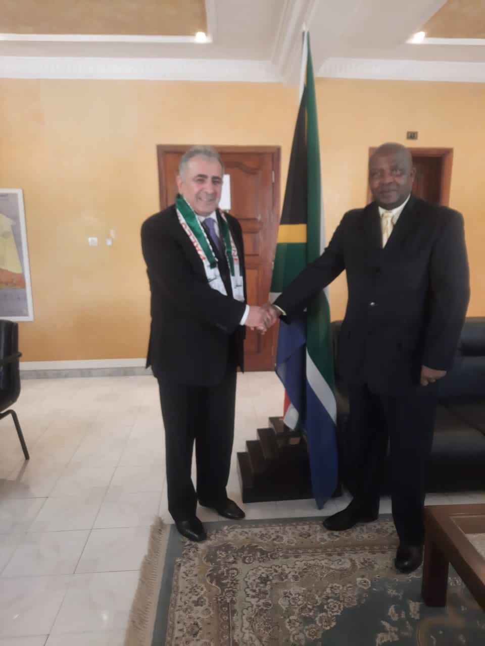 بتاريخ 12/01/2024 - قام سفير دولة فلسطين لدى موريتانيا مع الجالية الفلسطينية بزيارة سفير جنوب افريقيا تقديرً لجهود هذا البلد الشقيق رئيساً و حكومة و شعباً لوقوفها و دعمها للقضية الفلسطينية وتأييداً لمجريات محكمة العدل الدولية و قدم سفير دولة فلسطين هدية رمزية الكوفية الفلسطينية لسعادة السفير ، بدوره أكد سفير جنوب افريقيا دعم بلاده الدائم في المحافل الدولية لنصرة الشعب الفلسطيني