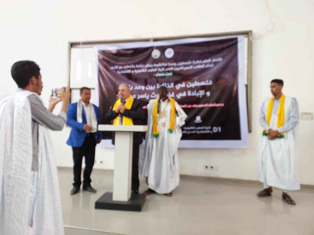الاربعاء 20/11/2024 - نظم الاتحاد العام لطلبة فلسطين في موريتانيا وحدة نواكشوط ، بالتعاون مع الاتحاد العام لطلبة موريتانيا في جامعة نواكشوط " كلية العلوم القانونية والاقتصادية" فعالية بعنوان " فلسطين في الذاكرة بين وعد بلفور وإرث ياسر عرفات إلى الحرب الابادة التي مارسها الاحتلال الاسرائيلي بحق شعبنا في قطاع غزة .