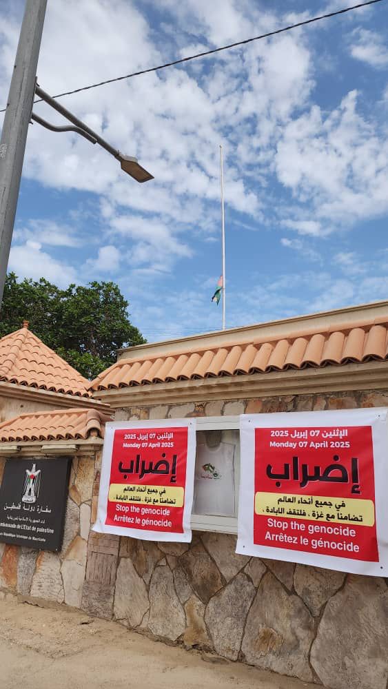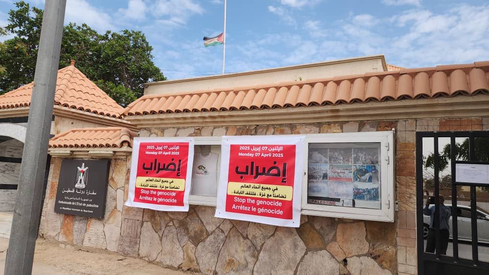 سفارة دولة فلسطين في موريتانيا تعلق لافتات الإضراب على واجهة مبنى السفارة في تفرغ زينه كما ظهر العلم الفلسطيني منكسا بفعل الاعداد المهولة للشهداء والمصابين جراء المحرقة التي يتعرض لها الشعب الفلسطيني الشقيق وخاصة في قطاع غزة المحاصر.
